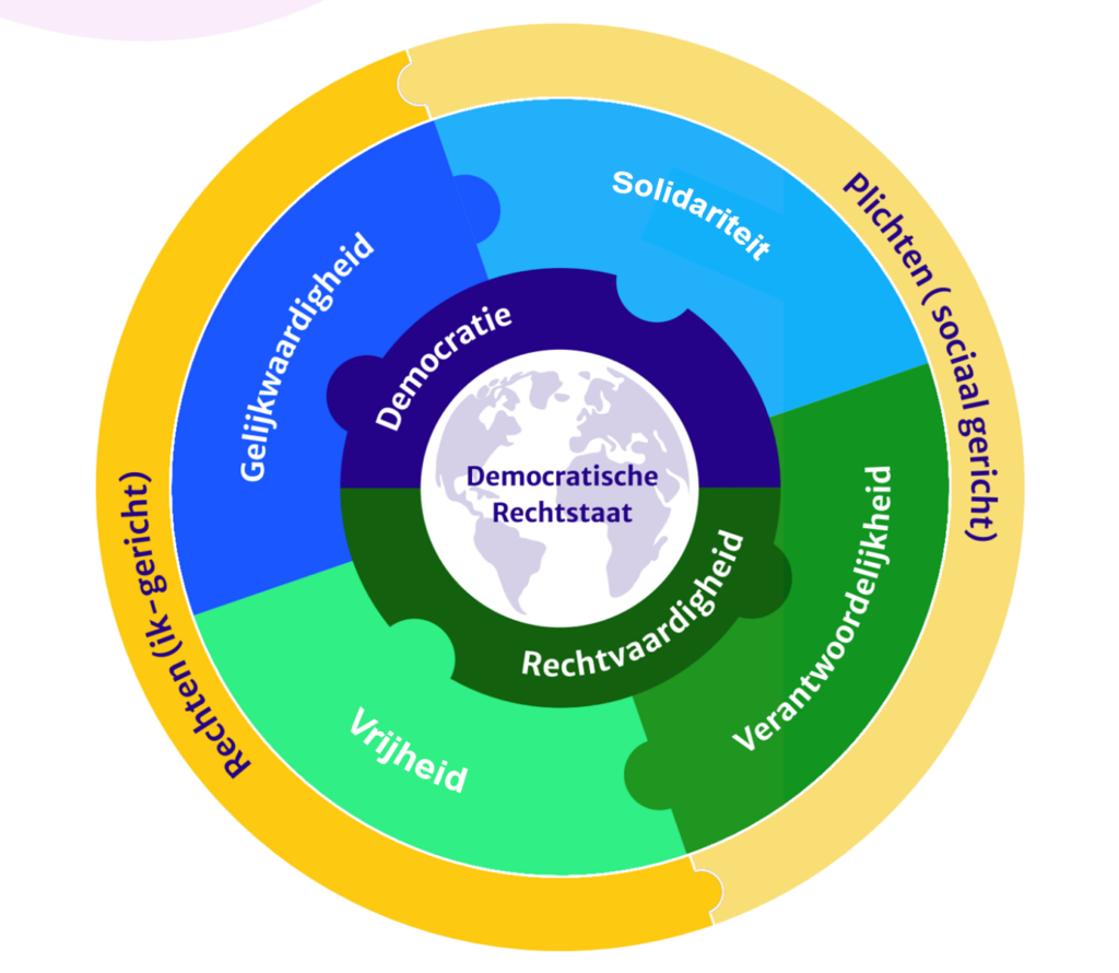 Onderstaand Wereldburgerschapsmodel (zie figuur 1) visualiseert (wereld)burgerschapsvorming vanuit een waardensysteem, waarin de democratische rechtsstaat de kern vormt, samen met de waarden vrijheid, gelijkwaardigheid, solidariteit en verantwoordelijkheid. De twee kernwaarden in het midden van het wereldburgerschapsmodel – democratie en rechtvaardigheid – raken vooral de instituties van de democratische rechtsstaat. De vier waarden eromheen hebben betrekking op de rechten en plichten van de mensen, de (wereld)burgers. Rechten richten zich op individueel belang, terwijl plichten op sociaal en algemeen belang gericht zijn. De vrijheid is verbonden met verantwoordelijkheid. Met andere woorden, het recht op vrijheid is niet vrijblijvend en schept de plicht je verantwoordelijk te gedragen ten aanzien van de vrijheden van anderen. Iedereen heeft de plicht na te gaan of zijn of haar vrijheden niet ten koste gaan van die van anderen of van het milieu. De gelijkwaardigheid staat in verbinding met solidariteit. Het recht op gelijkwaardige behandeling schept de plicht solidair te zijn ten behoeve van de gelijkwaardige positie van anderen.
